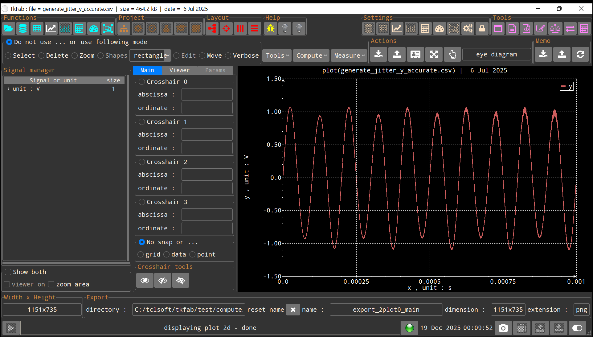 maths clear 1v {} maths create 1v ex1 maths expression1d 1v ex1 -name func1 -xstart 0.0 -xend 0.001 \ -formula { y = (1+(cos(_2pi*(0.5 + (rand()/50.0))*f*$t)/10.0))*sin(_2pi*f*$t) } \ -steps 10000 -algo fixed -var t -val y \ -pnames f -pvalues 10000 maths print 1v ex1 generate_jitter_y_accurate.csv -name func1 -var_units s -val_units "V" return 1