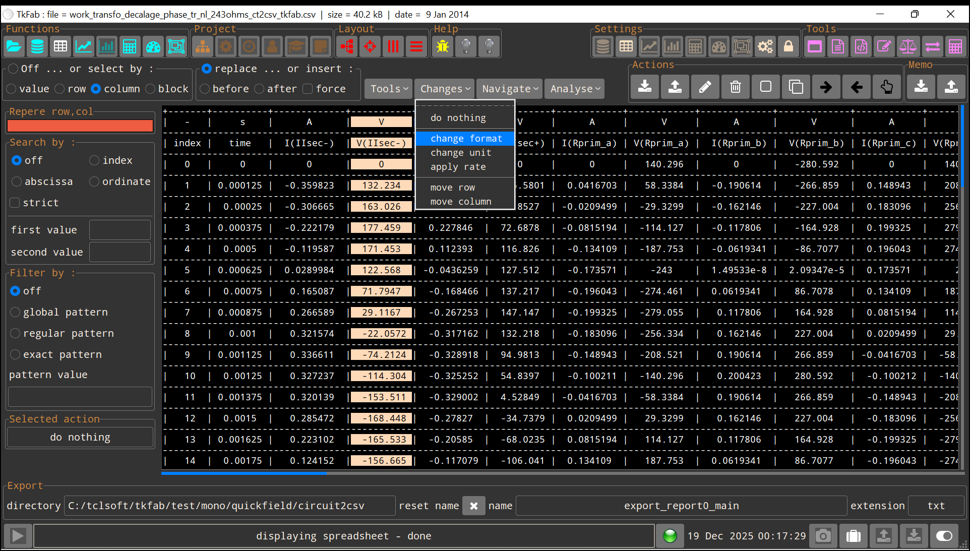 TkFab™ is a software whose objective is the simple manipulation of data ( CSV and TSV format) from technical software, or even spreadsheets. It is portable in return for not being able (yet) to handle large data files. TkFab™ can processed simultaneously several files such as changing format or filtering data values.