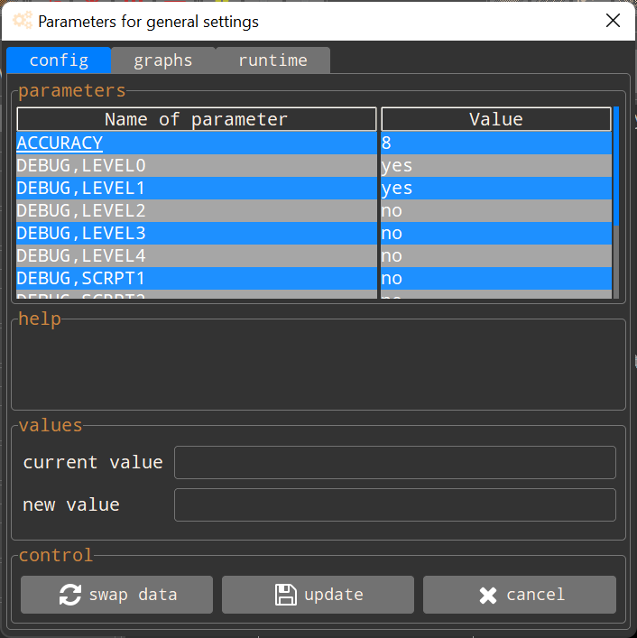 Data are simultaneously visible in the form of texts (tables) and graphs (2D plots). Inhibiting synchronism (i.e. when a modification occurs on both aspects at the same time) is not possible during input reading. Calculations or measurements always remain independent.